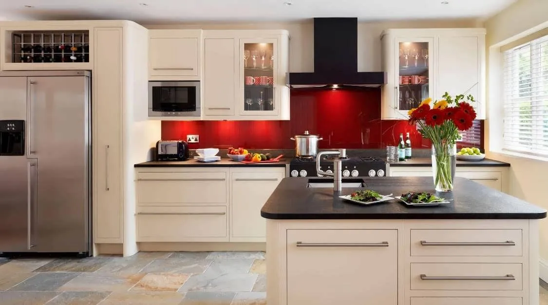 Более темные каштановые и вишневые цвета для фартука могут использоваться для затемненных мебельных стенок.