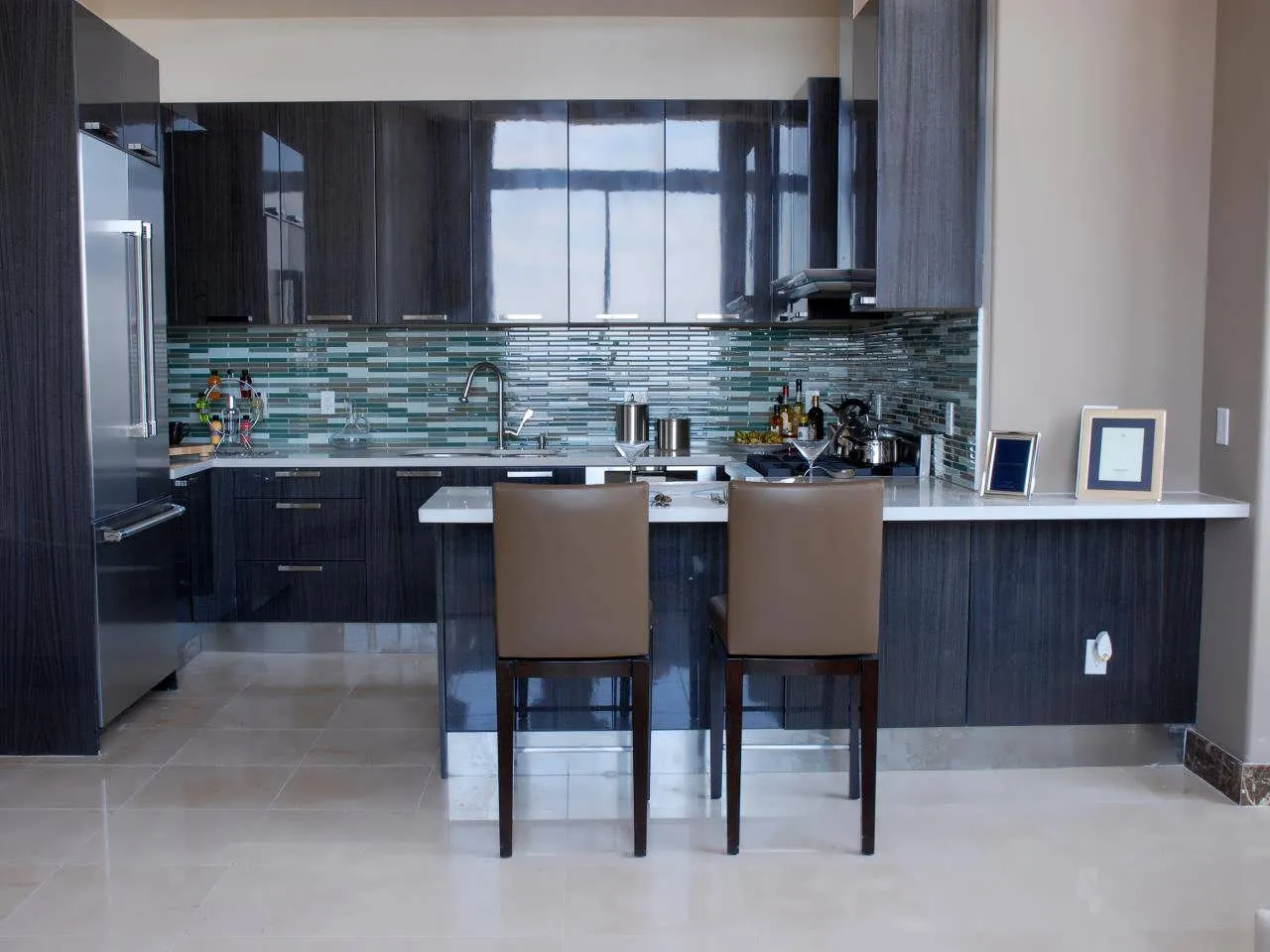 Очень темный, цвета горького шоколада фартук можно использовать только в контрасте со светлой мебелью и полами кухни.