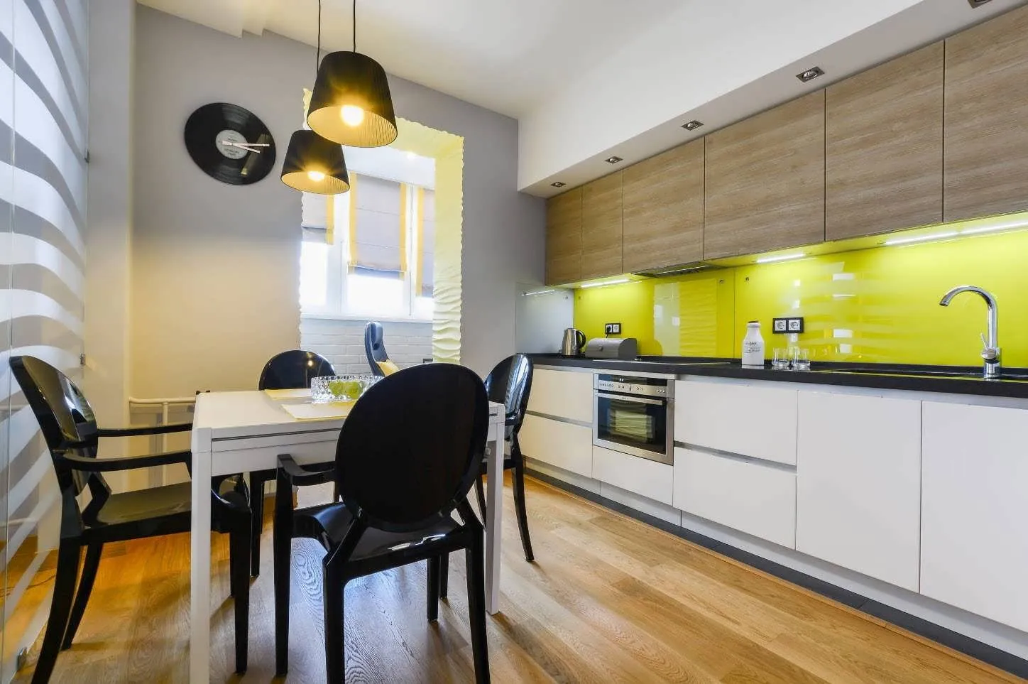 Для облицовки стены над столешницей можно использовать только водостойкие бесшовные ламели. Длина панелей не имеет особого значения, так как современная кухня перенасыщена бытовой техникой, и спрятать стыки не составит особого труда.