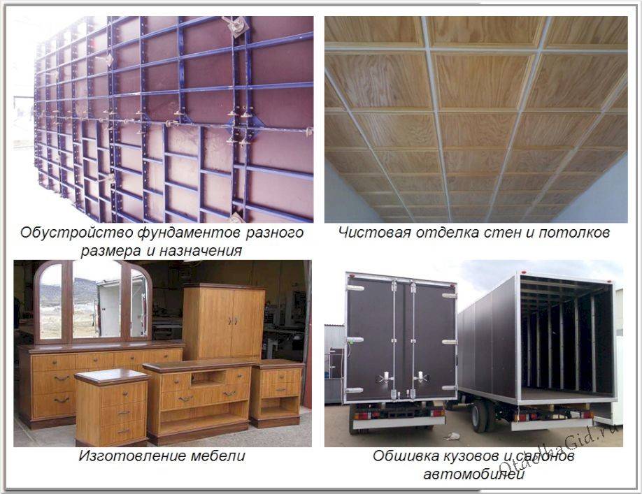 - в строительстве – для обустройства опалубок, строительства лесов, отделки складских помещений и пр. Также не редко ее применяют для отделки жилища благодаря большому выбору цветов и текстур поверхности;
