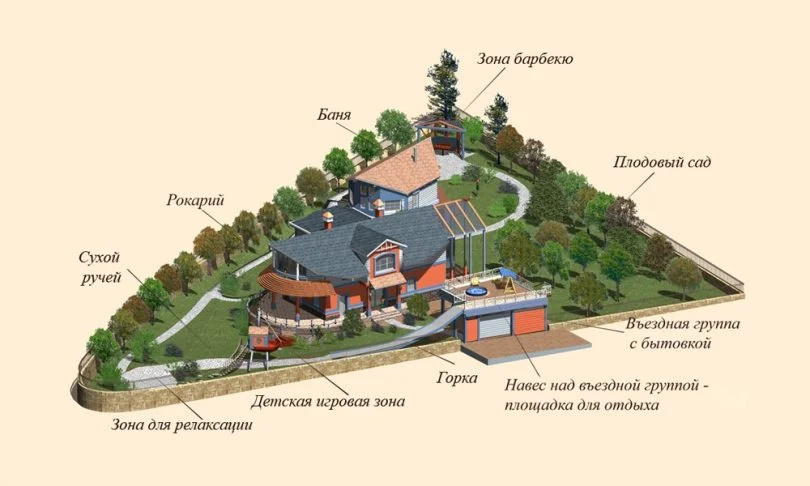 Неправильный рельеф участка с большим уклоном сулит владельцу дополнительные затраты на его обустройство. Планировка ориентируется именно на рельеф. Под дом стоит отвести самое высокое место из возможных