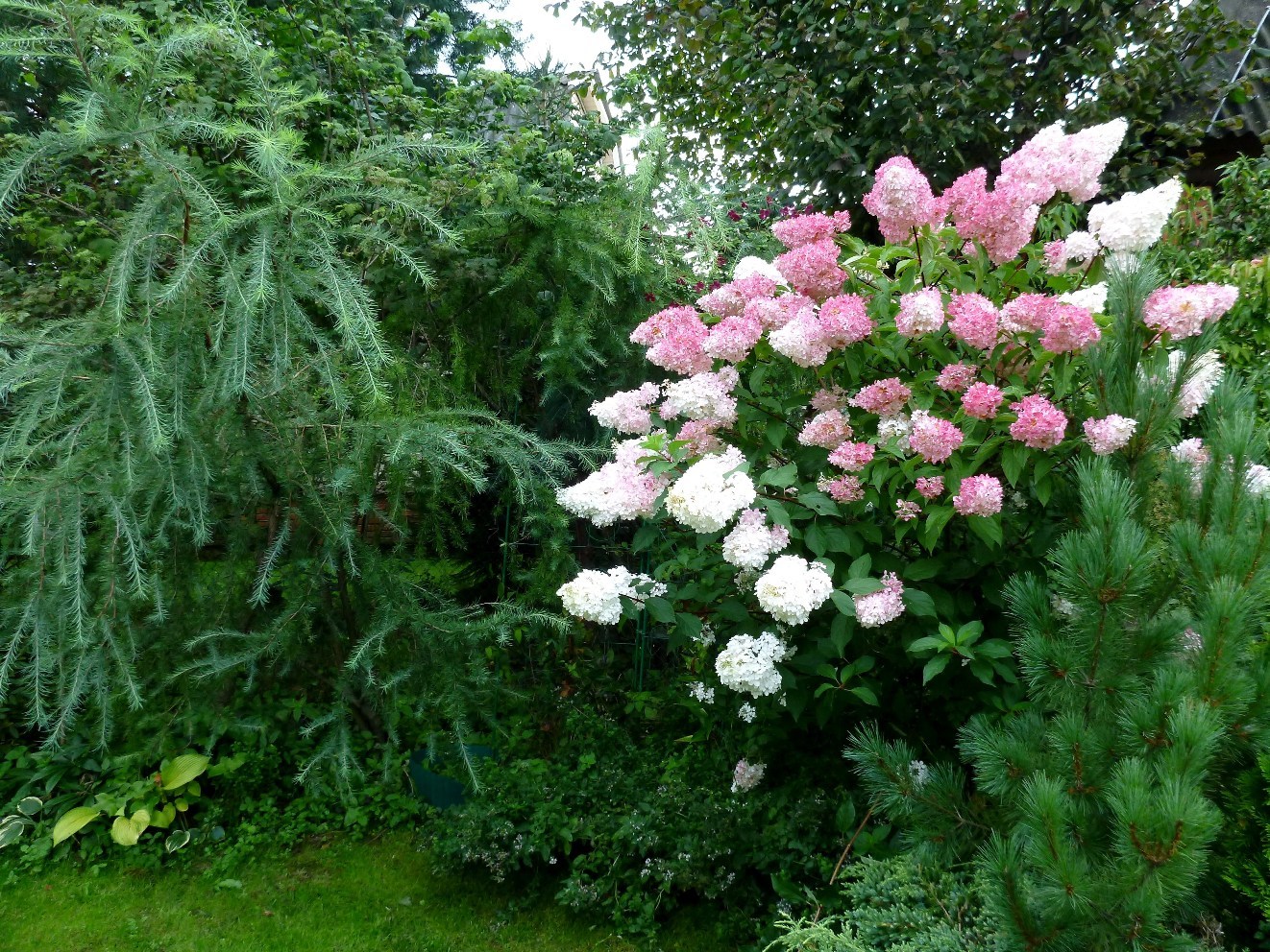- Для следующего яруса подбирают красивоцветущие кустарники: розы, гортензию метельчатую и пузыреплодник. К ним можно добавить дельфиниум и рудбекию.