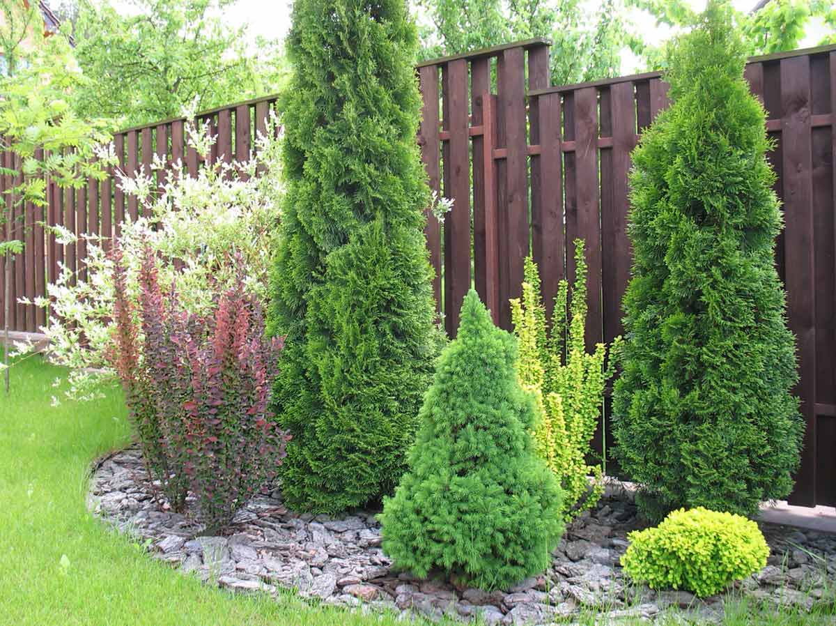 Благодаря хвойным растениям, клумба сохранит эстетичность и в зимний сезон. Для смешанных миксбордеров рекомендуются туи, можжевельники и миниатюрные сорта пихты. Они не закисляют почву и не создают тень, от которой будут страдать остальные культуры.