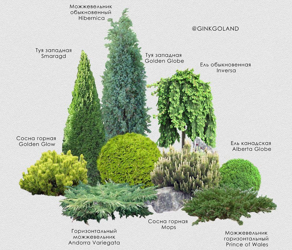 Как правило, самые большие деревья должны иметь более темный окрас, и тогда на их фоне будут красиво выделяться низкорослые растения, имеющие голубоватый или светло-зеленый оттенок. Если хвойники используются для оформления каменной россыпи или горки, не следует приобретать габаритные или быстрорастущие формы.