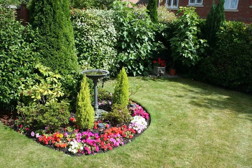 В качестве основной детали композиции выбирается раскидистый куст или высокое дерево. Оно высаживается в центральной части участка, а вокруг распределяется растительность меньшего габитуса. Чтобы зелень не сливалась, растения подбираются с разными оттенками зеленого. Также можно посадить растения с голубой и желтой хвоей.