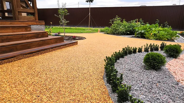 Дорожки делают из бетона, натурального камня, тротуарной плитки. Для самостоятельного исполнения лучше выбрать песок, гравий, щебень, щепу, спилы дерева.