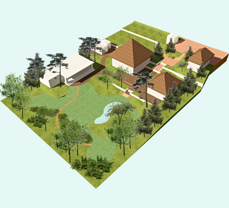 При планировке жилой зоны важен и дизайн, даже учитывается форма крыши дома и другие элементы.