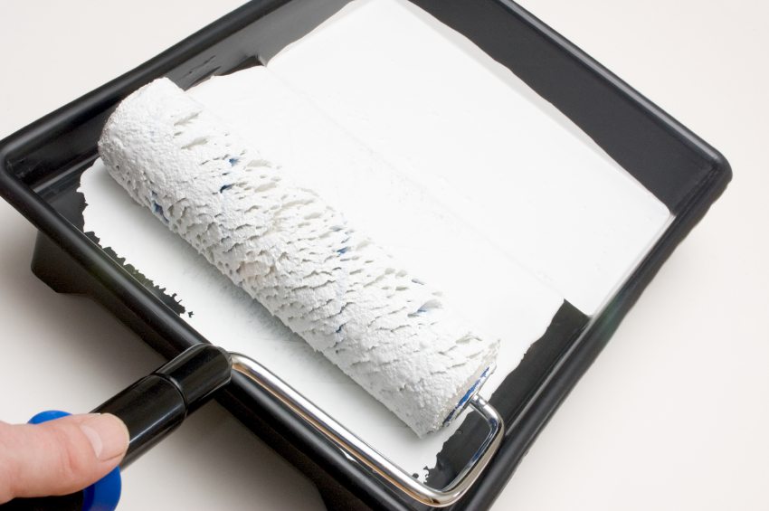 - Подготовить краску, если слишком густая – немного разбавить водой (пропорция должна быть указана на банке, обычно 5:1) и налить в лоток для набора малярным инструментом.