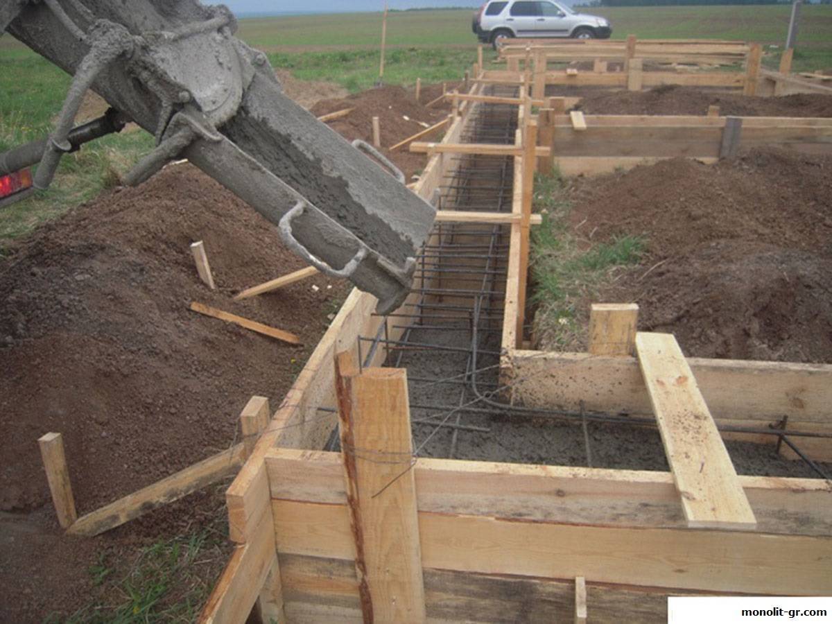 Технология возведения фундамента предполагает, что заливка ленты будет выполнена за рабочую смену, а такой объём бетонной смеси подготовить даже при помощи бетономешалки проблематично. Из-за этого возникает необходимость закупки бетона у производителя, что также является весомой тратой.