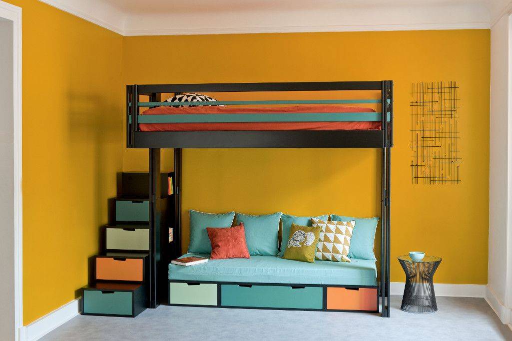 «Двухэтажная» кровать-чердак идеально смотрится лишь в комнатах с достаточно высокими потолками. Для остальных помещений лучше подобрать другой вид мебели.