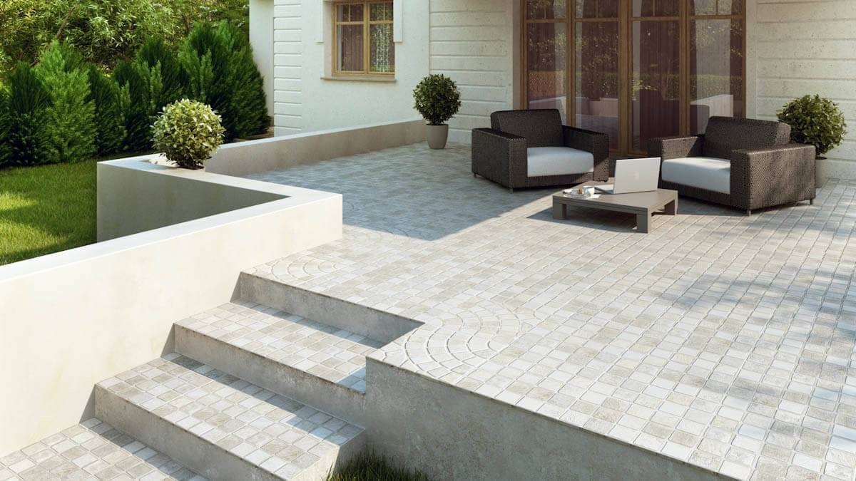 - Бетонные сооружения не обходятся без последующей отделки, благодаря чему приобретают привлекательный экстерьер. Чаще всего для оформления входа перед террасой применяют керамогранит или клинкерную плитку.