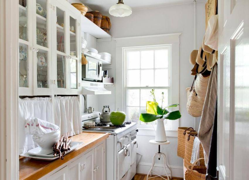 - Для хранения посуды повесьте на стены шкафчики с дверцами или занавесками.