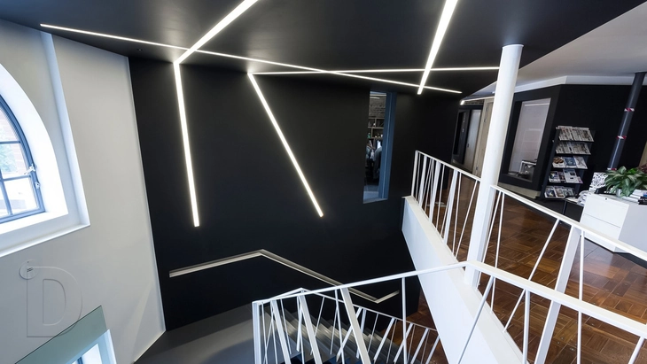 Световые линии на натяжном потолке в спальне часто размещают над кроватью, обозначая таким образом место отдыха. Для эффектности можно спустить световые линии с потолка на стену над кроватью.