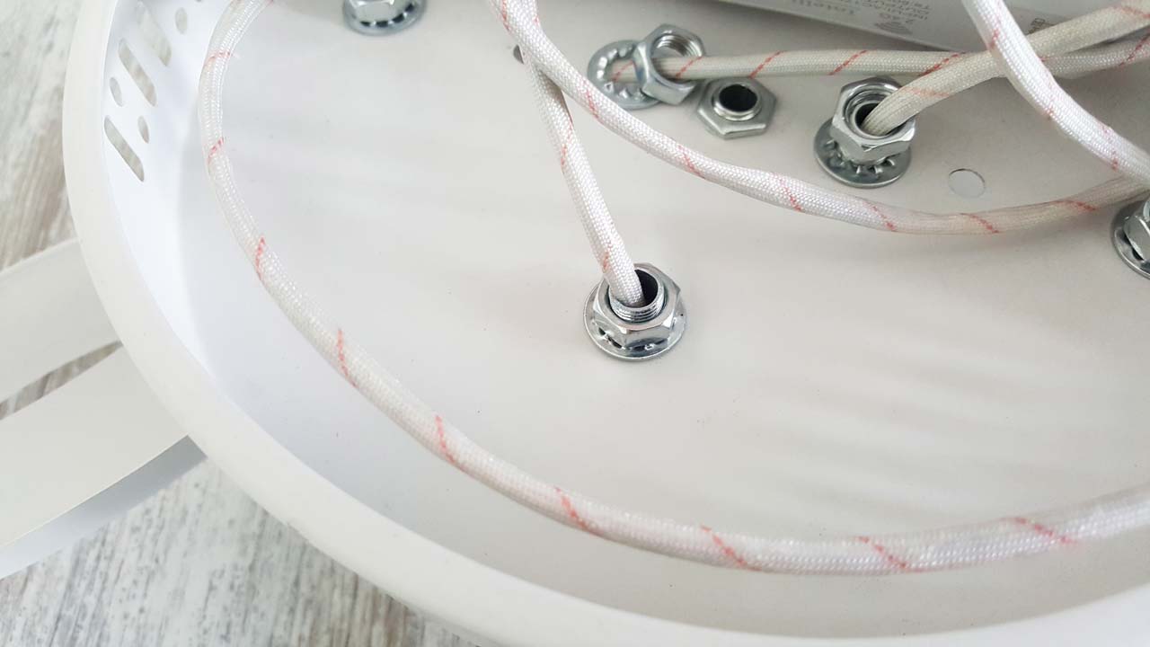 После, основание люстры крепится к планке на декоративные гайки. Единственная сложность заключается лишь в том, что с первого раза у меня не получилось точно попасть в отверстия для болтов на корпусе.