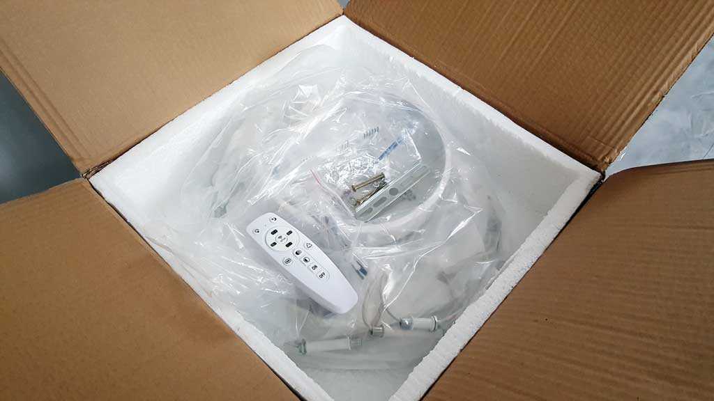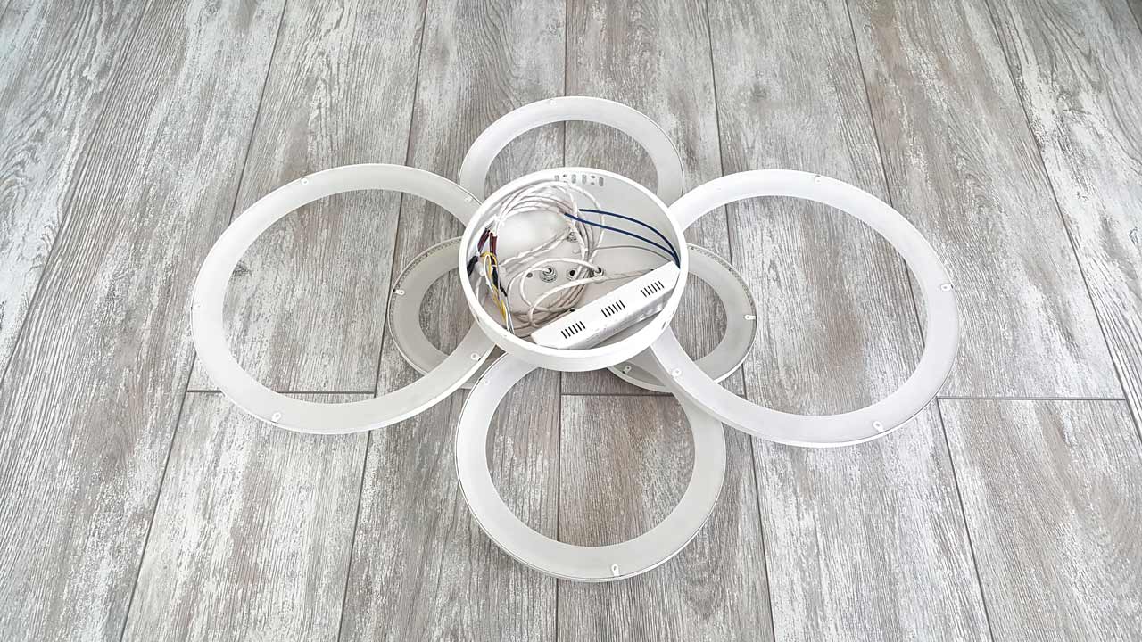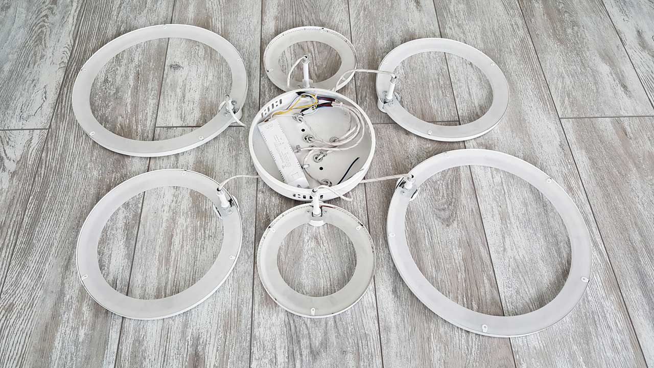 Люстра из коробки идет уже с подключенной проводкой от светодиодной подсветки к блоку питания. Мне потребовалось лишь закрепить поочередно кольца к основанию люстры гайками при помощи ключа. Крепятся они попарно на разной высоте — сначала большие и в конце самые маленькие.