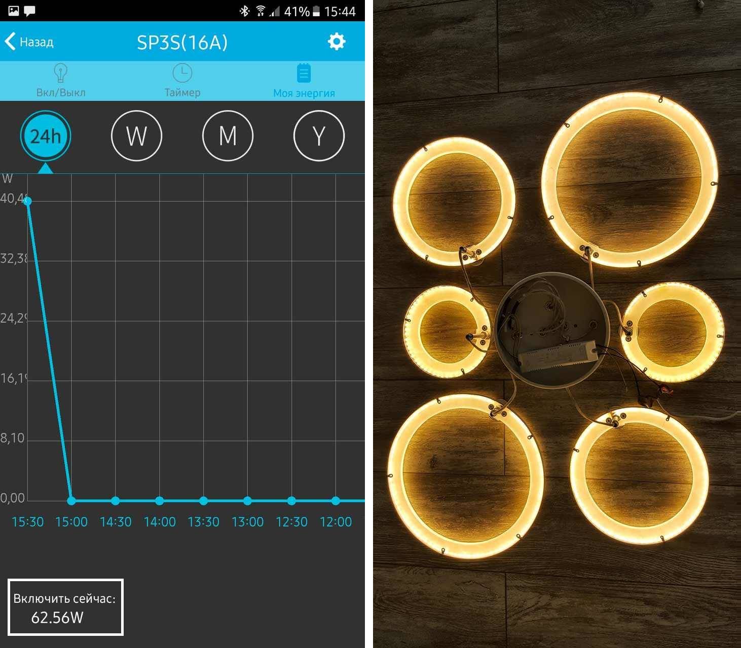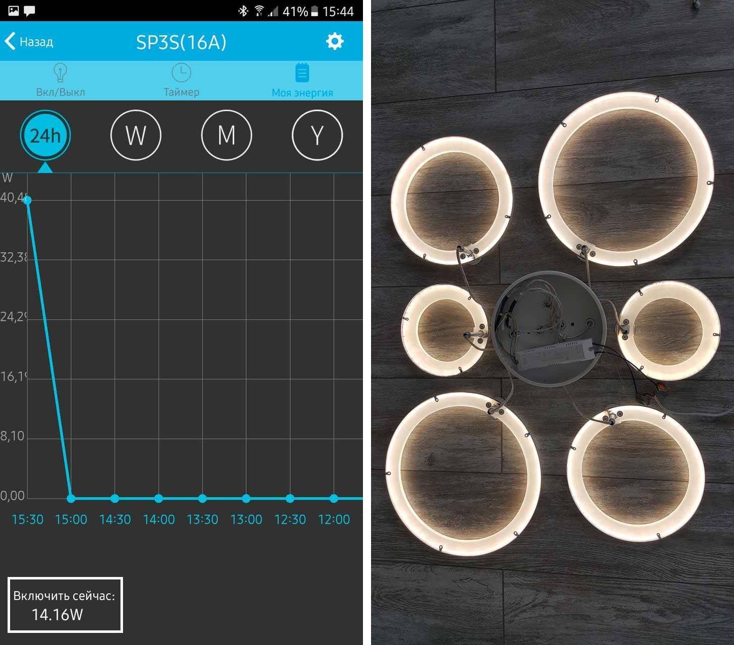 В моем случае потолочная лед люстра на шесть колец отлично справляется с освещением комнаты 18 квадратных метров. При этом на максимальной яркости потребляет всего 121 Вт. Расчеты производились с помощью умной Wi-FI розетки, которая умеет измерять энергопотребление подключенного к ней устройства. Ниже на скриншотах представлены данные по потреблению в разных режимах свечения на максимальной яркости.