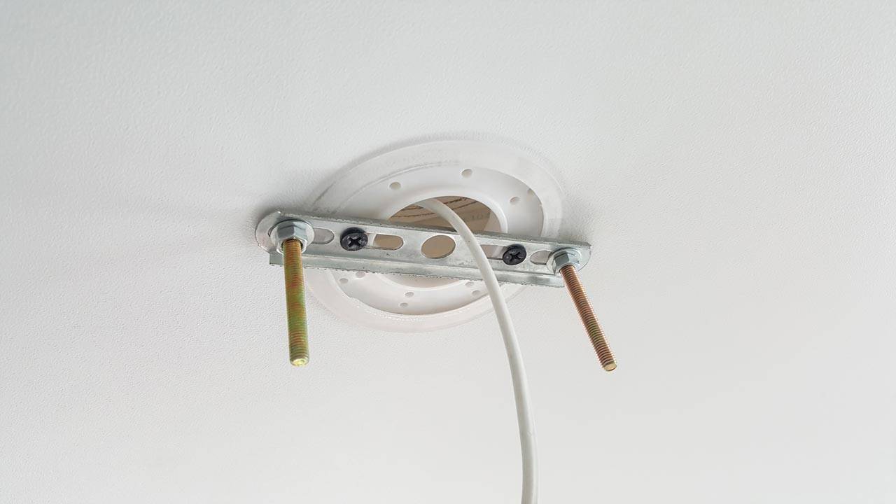 Устанавливал люстру самостоятельно. Здесь оказалось все просто и интуитивно понятно. Сначала крепится планка непосредственно к потолку на два шурупа (в моем случае это была «закладная», установленная при монтаже натяжного потолка). На ней фиксируется два болта.