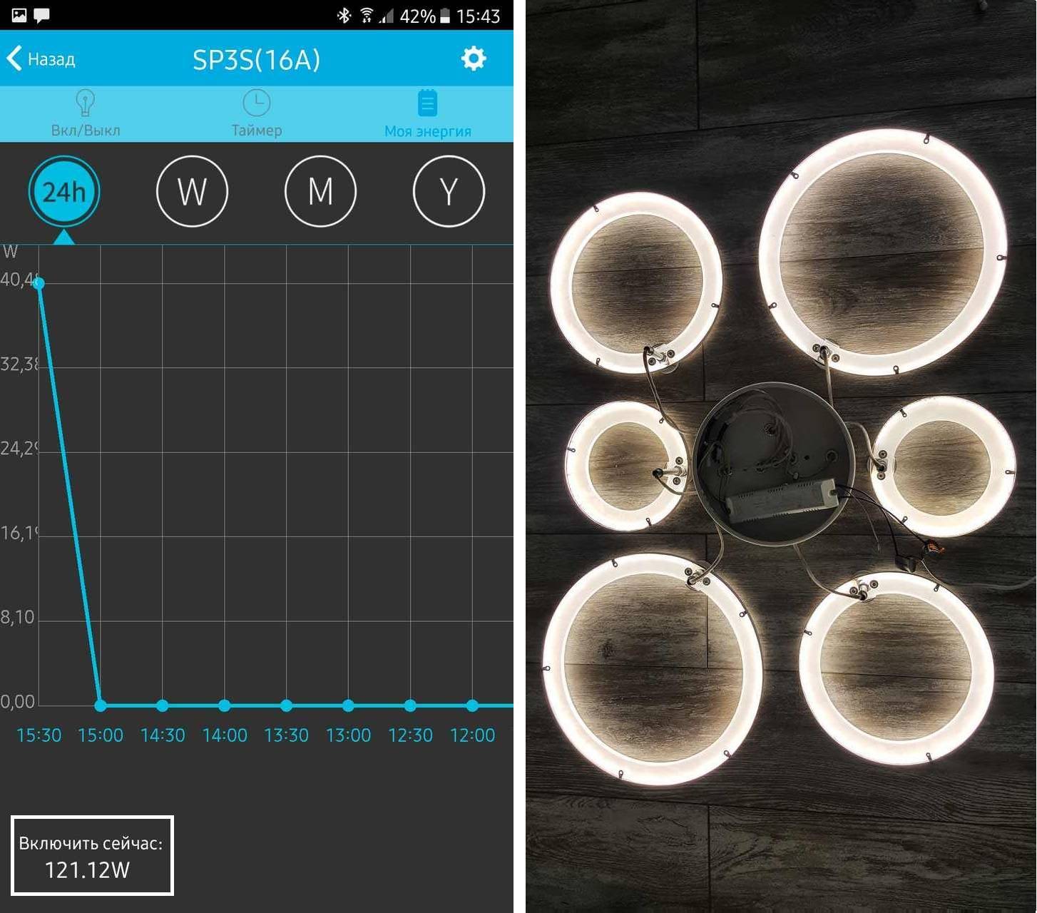 В моем случае потолочная лед люстра на шесть колец отлично справляется с освещением комнаты 18 квадратных метров. При этом на максимальной яркости потребляет всего 121 Вт. Расчеты производились с помощью умной Wi-FI розетки, которая умеет измерять энергопотребление подключенного к ней устройства. Ниже на скриншотах представлены данные по потреблению в разных режимах свечения на максимальной яркости.