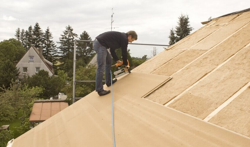 На заметку! При использовании кровельных сип-панелей необходимость дополнительного утепления отпадает. Панель напоминает сэндвич из двух OSB листов с прослойкой 200 мм пенопласта. Панели укладывают на деревянное основание и соединяют в пазы брусьями.