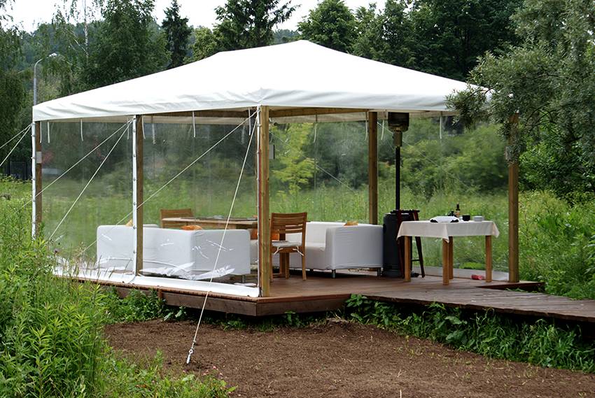 Мягкие окна – это актуальная альтернатива стандартному остеклению. У них есть два главных преимущества: стоимость и простота монтажа и демонтажа. Так как беседка является временным сооружением, то для ее облагораживания отлично подойдут полиуретановые полотна.