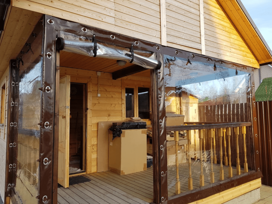 Исходя из пожеланий клиента и возможности установки, мы предлагаем установку нашими специалистами! В таком случае происходит немного иной вариант монтажа мягких окон ткани ПВХ на террасу. Мы их привозим на объект, потом расставляем скобы, а фурнитуру, люверсы и ремешки, устанавливаем по месту. Также возможно подогнать не стандартные изгибы или вырезы. Что позволит добиться правильного натяжения, и внешнего вида как у обычного остекления.