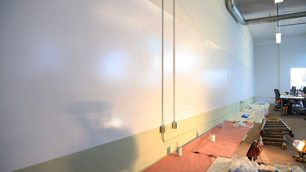 Если после нанесения магнитной краски, вы планируете ее дополнительно покрасить маркерной, то нанесенный материал следует хорошо затереть наждачной бумагой. После этого нужно покрыть стену грунтовкой