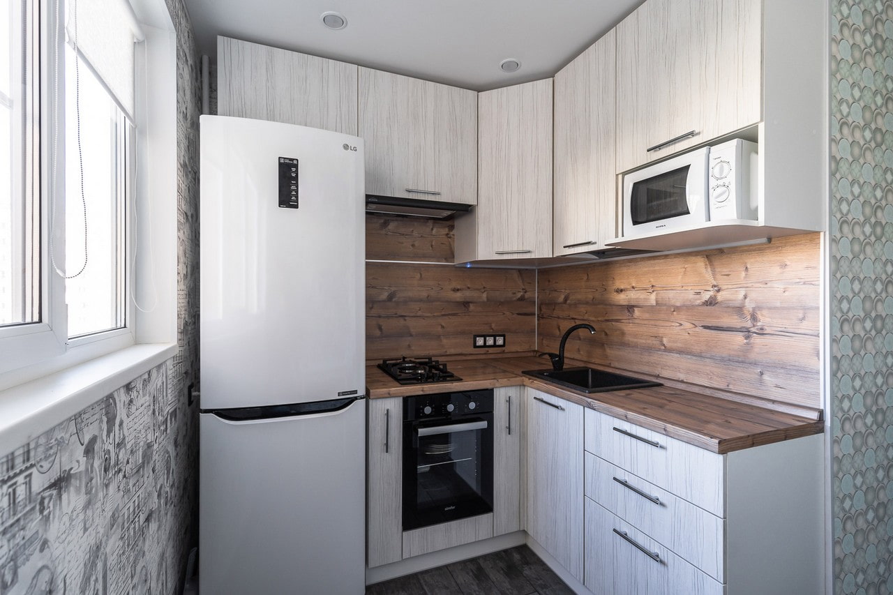 В монтаже и размещении больших предметов бытовой техники на кухне с подобной планировкой есть определенные особенности, нюансы, которые важно учесть