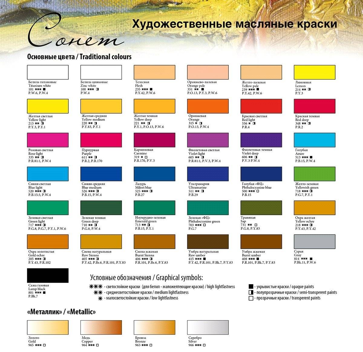 Для правильного выбора красящего материала необходимо ориентироваться в его характеристиках. Для масляных красок такими параметрами являются: