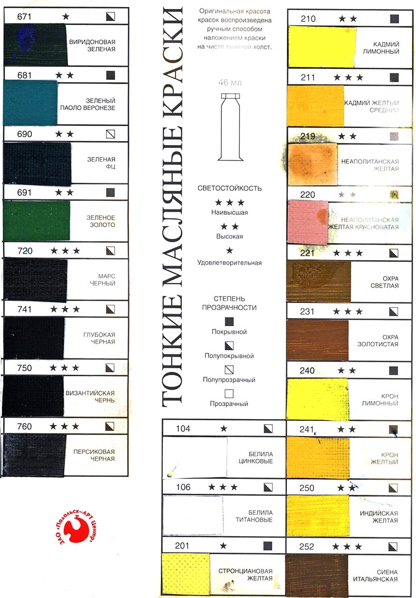 Это тонкотертая масляная краска, изготовлена из пигментов высокой яркости и чистоты цвета. В состав данных красок входят натуральные дорогостоящие пигменты. В палитре «Подольских» красок практически нет имитаций.