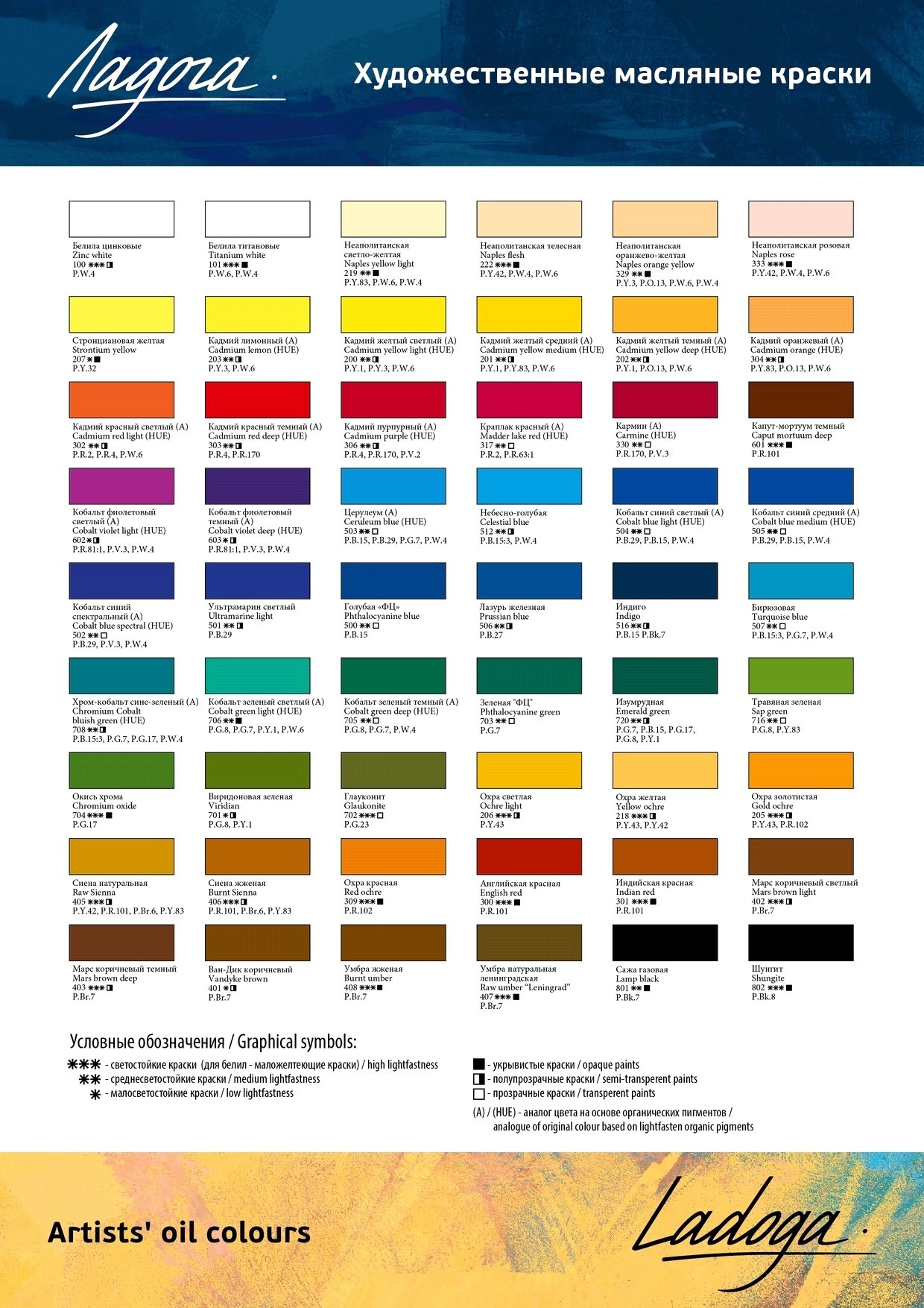 В составе художественных материалов от «Ладоги» — качественные пигменты и связующее на основе льняного масла. Масло отличается отсутствием в палитре красок на основе дорогих пигментов кадмия и кобальта (заменены маслом на базе комбинаций органических пигментов, максимально схожих с оригинальными пигментами).