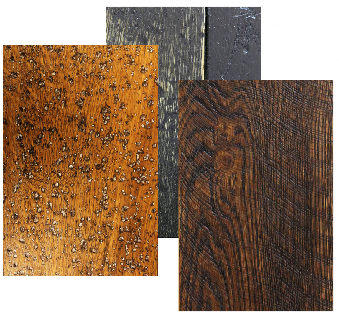 - Наиболее популярные механические и декоративные визуальные обработки: нанесение фаски, искусственное состаривание, стилизации под латунь и бронзу, браширование, эффект строганной доски, эффект распиленной доски.