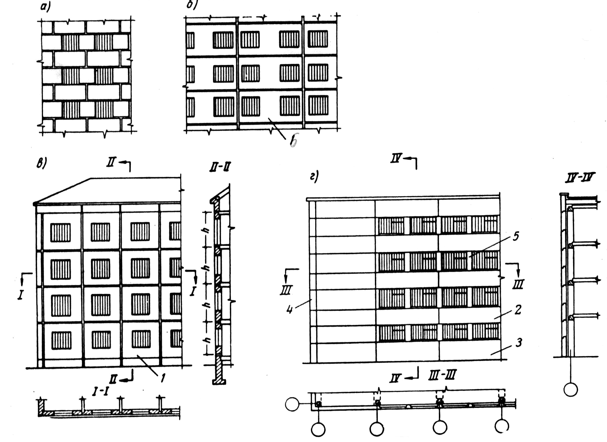 Для крупнопанельного строительства разрезка наружных стен на панели определяется размером панелей. Она может быть различной и зависит от конструктивной схемы, условий монтажа, вида здания и его размеров. В бескаркасном строительстве применяется однорядная схема разрезки стен на панели, одна панель на высоту этажа (рис. 4.29 б, в), а в каркасном строительстве – преимущественно двухрядная (рис. 4.29 г).