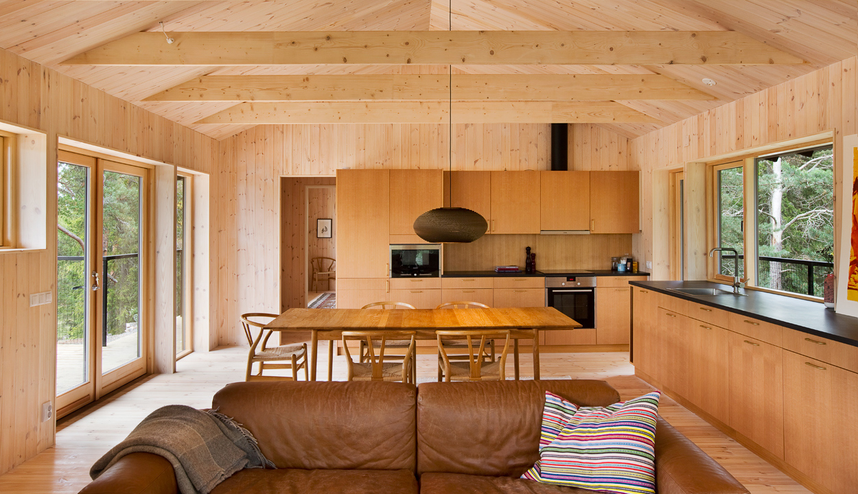 • Низкая теплопроводность Помещение, имеющее такую обделку, будет прекрасно сохранять тепло зимой и не выпускать прохладу летом. Поэтому многие выбирают деревянные панели в качестве основного материала для дачных домиков или загородных фазенд.