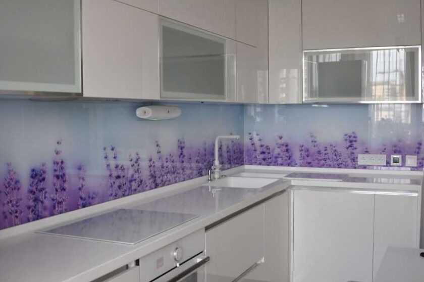 - Стекло. Это наиболее прогрессивный выбор. Стекло быстро отмывается, позволяет создать уникальную подсветку. На таком фартуке можно поместить рисунок или фотографию. Стекло используется закаленное. Возможен вариант с матовым или тонированным стеклом. Отсутствие швов облегчает уход за фартуком. Недостаток — хрупкость, которая может проявиться в процессе монтажа или эксплуатации;