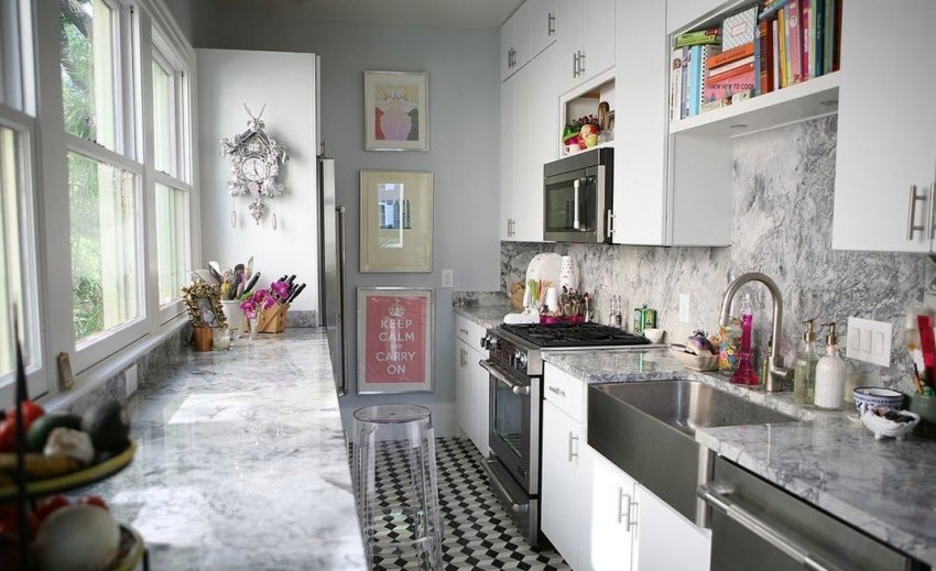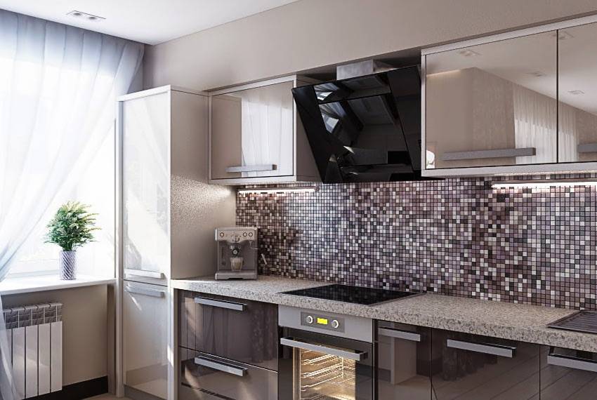 Прекрасно декорированный фартук органично впишется в любой стиль помещения, станет настоящим украшением кухни с балконом. Для этих целей используется не только кафель, но и эффектная мозаичная плитка, фотопечать на стекле, зеркальное полотно или листы хромированного металла.
