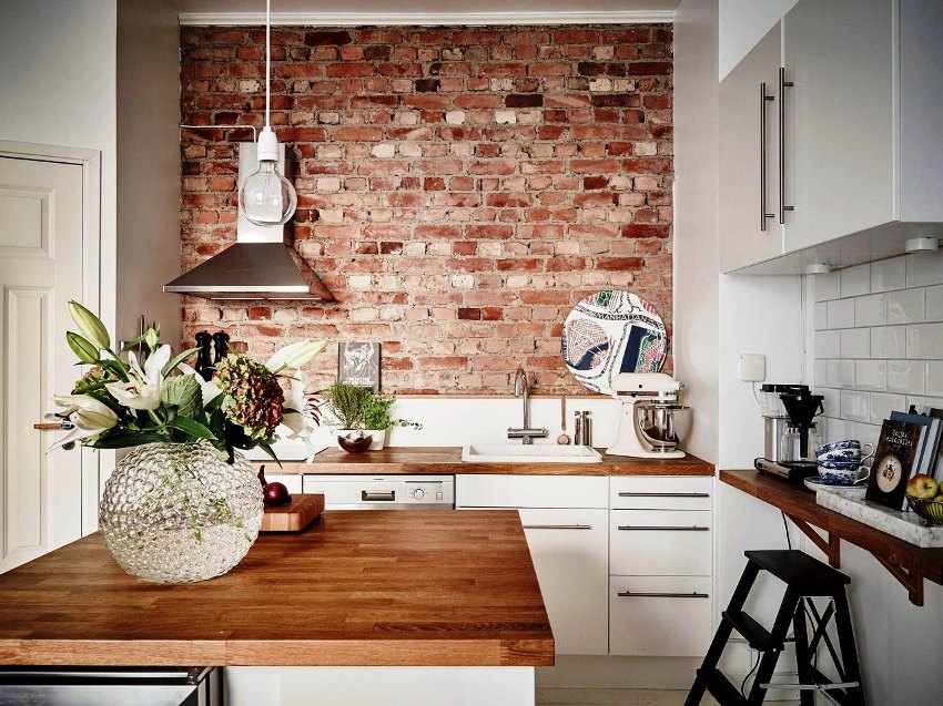 Наиболее удачное решение в отделке кухни декоративным камнем – вставки в углах или на стене, облицовка вокруг мебельного гарнитура или определенной зоны. При этом он хорошо сочетается с различными материалами декора и может стать прекрасной альтернативой обоям или кафелю.