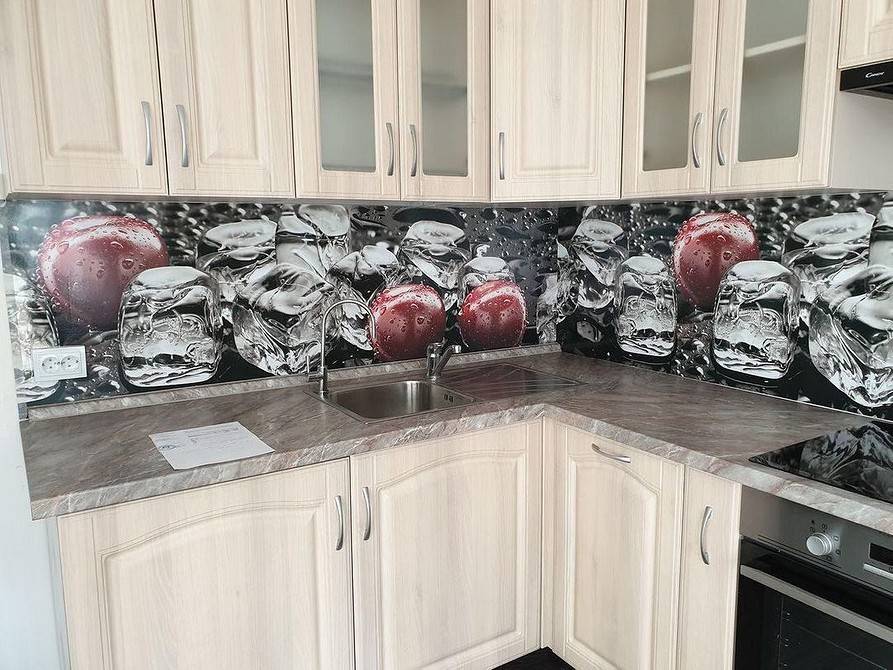 Также весьма эффектный вариант с точки зрения дизайна и эффективно – с точки зрения защиты и практичности. Специальное каленое стекло обладает высокой прочностью и долговечностью (до 5 лет), легко моется, успешно противостоит влаге, жиру и копоти. К тому же, монтаж стеклянного фартука производится гораздо проще, нежели укладка плитки, а сам фартук не имеет швов. Правда, следы от брызг и жира на стекле более заметны. Да и выбор цветовых решений и вариантов текстур по сравнению с плиткой или пластиком существенно менее богат. Не говоря уже о том, что стоит такое стекло гораздо дороже плитки.