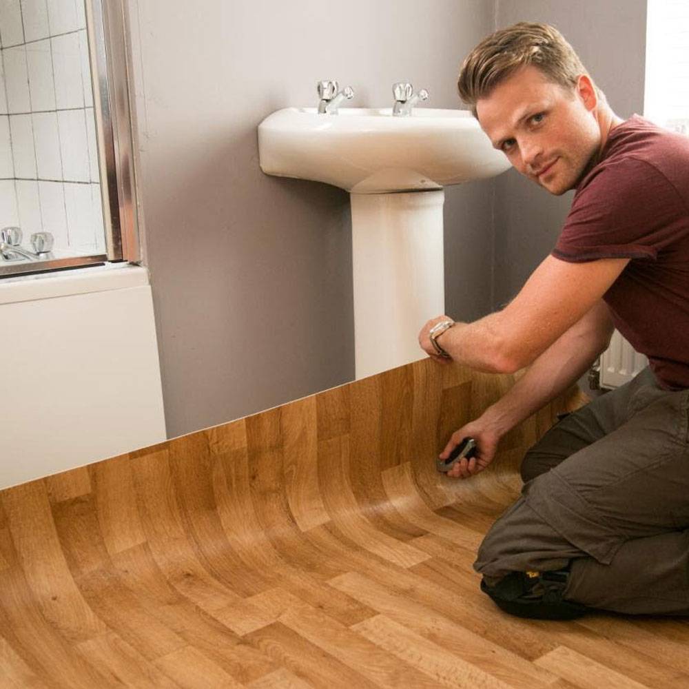 Это покрытие выступает альтернативой традиционной керамической плитке: стоит он дешевле, но отлично защищает пол от влаги. Современные компании выпускают линолеум, неплохо имитирующий текстуру дерева, кафеля или камня, поэтому ванная комната будет выглядеть достойно и эстетично.