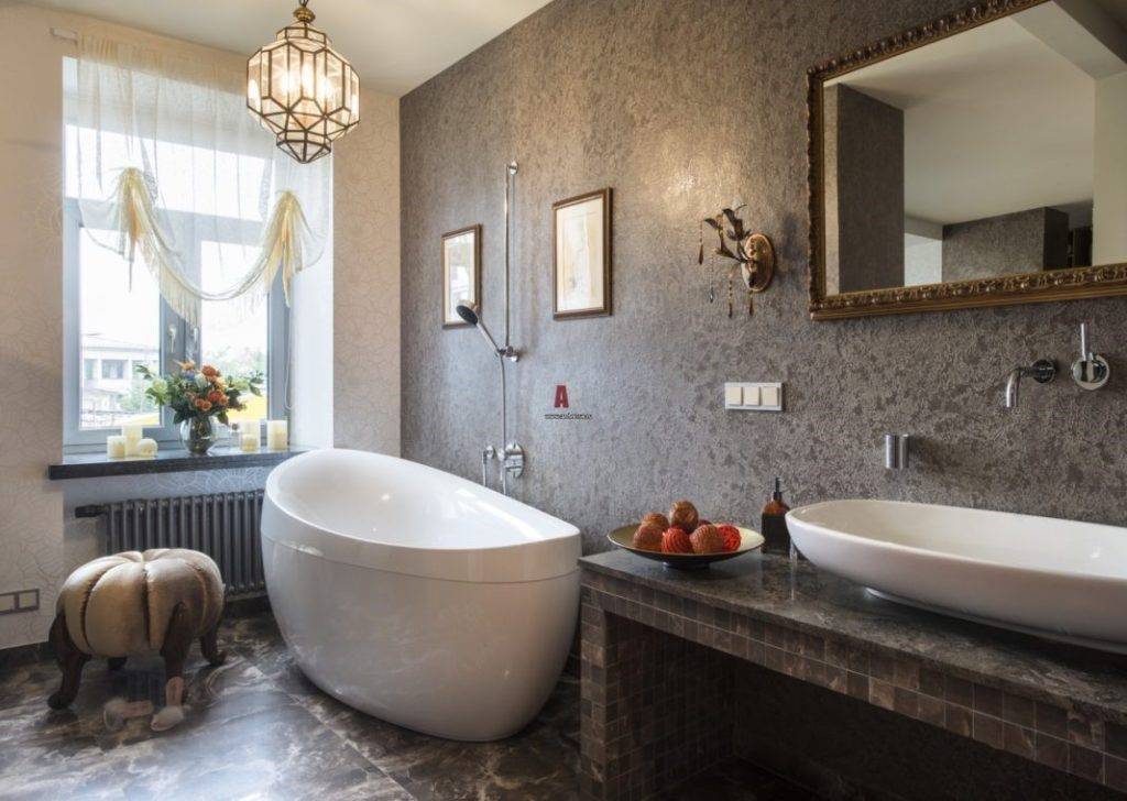 Декоративная штукатурка имеет красивый вид и глянцевую поверхность, за счет чего стены в ванной должны быть идеально ровными, а также следует тщательно подбирать черновой и чистовой материал, проводить надлежащую изоляцию стен и пола. После проведения отделки стен ванной получится вид, вроде они отделаны мрамором. В некоторых случаях картинка может меняться как в калейдоскопе.