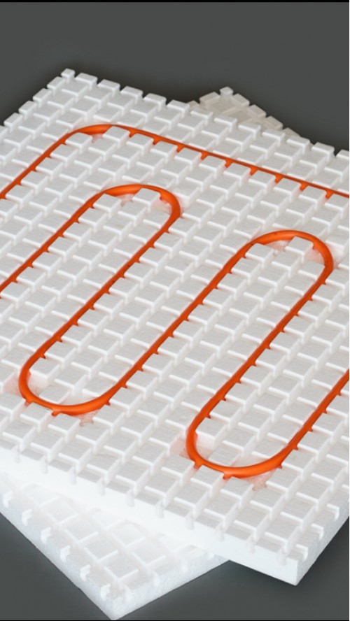 Использование подобных матов позволяет смонтировать теплый пол, который может стать основным источником обогрева. Плоские маты из экструдированного полистирола (ЭППС) толщиной 40÷50 мм с фольгированным покрытием вполне применимы для водяного теплого пола, но с некоторыми оговорками. Важна высокая плотность ППС – около 40 кг/м3. Данный материал не имеет гидрозащиты, поэтому потребуется перед укладкой труб застилать его полиэтиленовой пленкой.