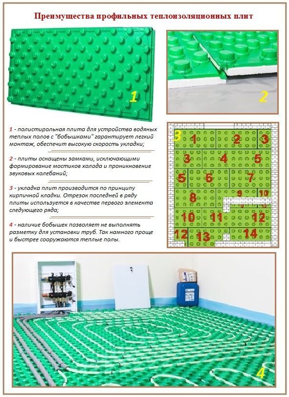 Это самый удобный в плане укладки труб водяного теплого пола вариант. Пенополистирольные профильные маты изготавливают по технологии штамповки, что позволяет придать им сложную конфигурацию. На их верхней поверхности имеются фигурные выступы-бобышки различной формы (прямоугольные, цилиндрические, треугольные) высотой от 20 до 25 мм. В образующиеся между бобышками пазы плотно укладываются трубы отопления, получая отличную фиксацию, полностью исключающую смещение труб во время заливки стяжки.