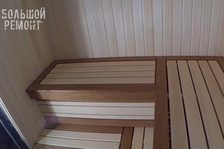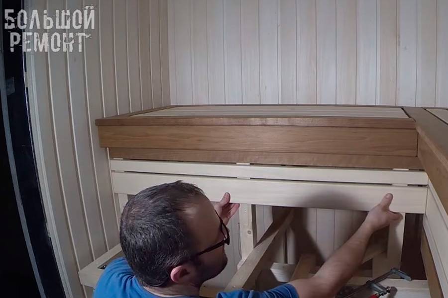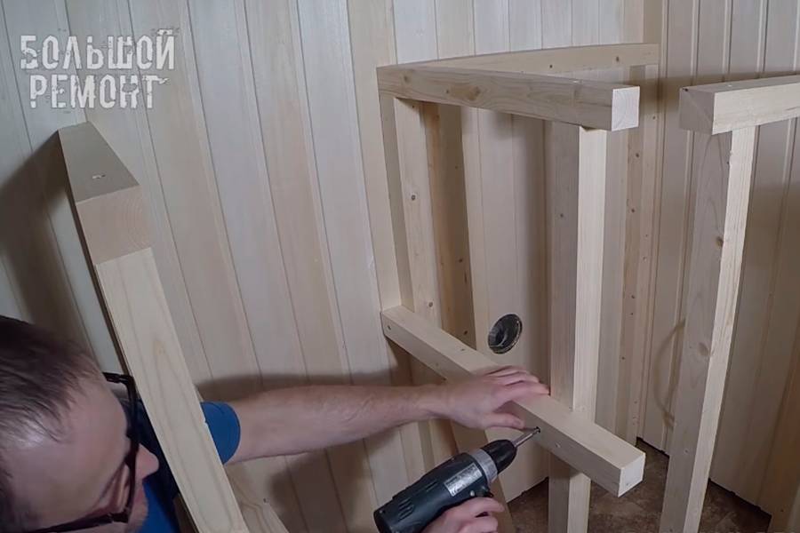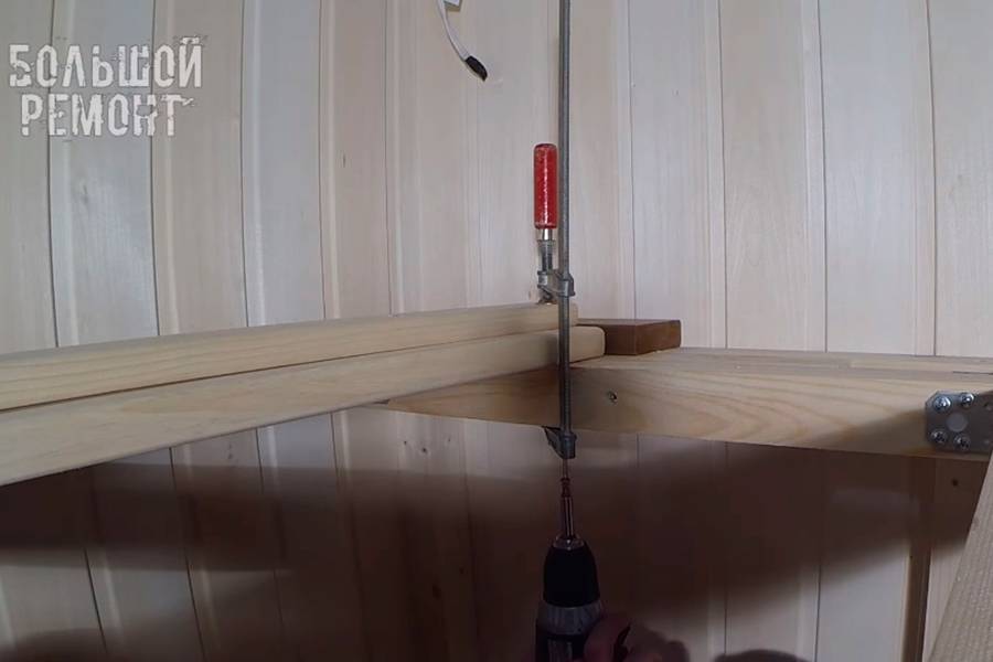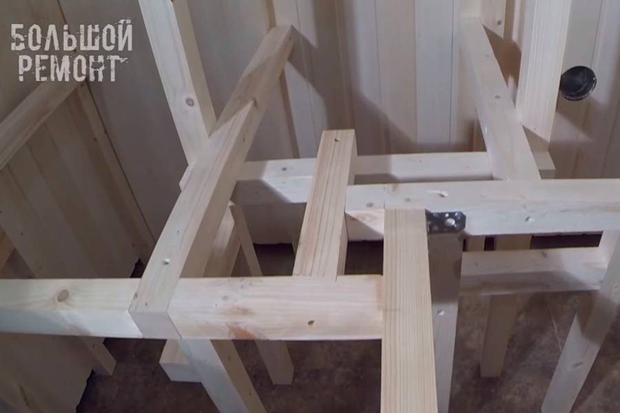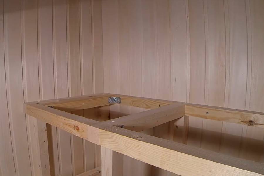 Процесс сборки начинается с изготовления несущего каркаса. Это конструкции в форме буквы «П», одной стороной прикрепленные к стене (точнее, к обшивке). Вторая вертикальная деталь соединяется с подобной конструкцией меньшего размера. В сумме получаются опоры для низкой лавки и более высокой лежанки.