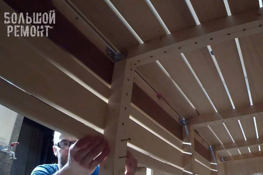 Сборку опор производят на обычные шурупы. Существует мнение, что для бани сборку надо делать только на столярные соединения (шип-паз). Проблема в том, что для этого необходимы соответствующие станки. Гораздо проще собрать опоры с помощью обычных шурупов с утопленными в древесину шляпками.