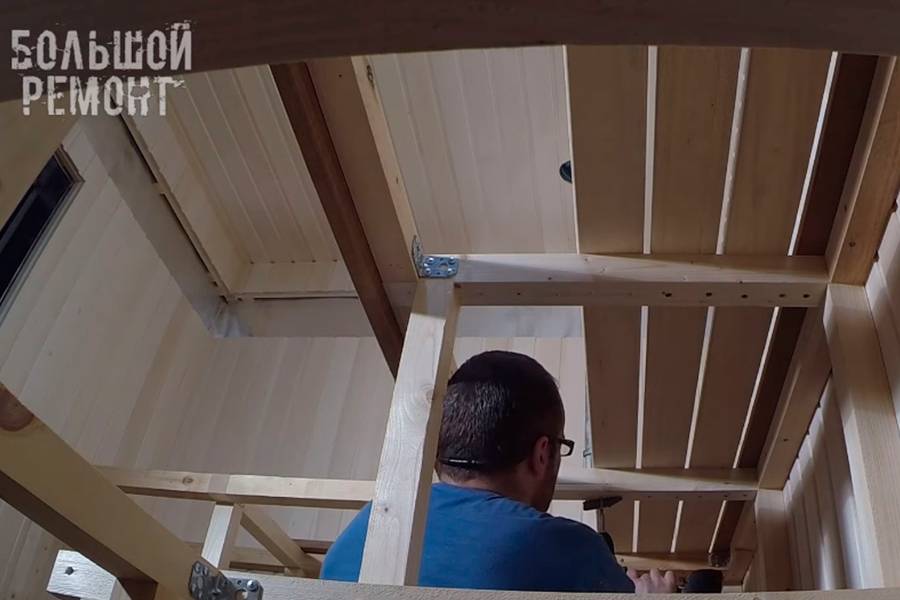 Опоры устанавливают на заранее назначенное место и крепят к стенам и полу. Затем на них начинают укладывать доски. В саунах заполнение настила часто выполняется в поперечном направлении — это делает поверхность более привлекательной. Но, для русской бани этот вариант не годится. Торцовые участки досок могут стать причиной неприятных ощущений и даже заноз.
