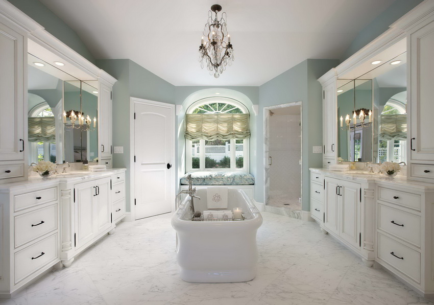 Используйте большие, возможно хрустальные люстры и радиальное оформление потолка: основной источник света должен быть «вездесущ».