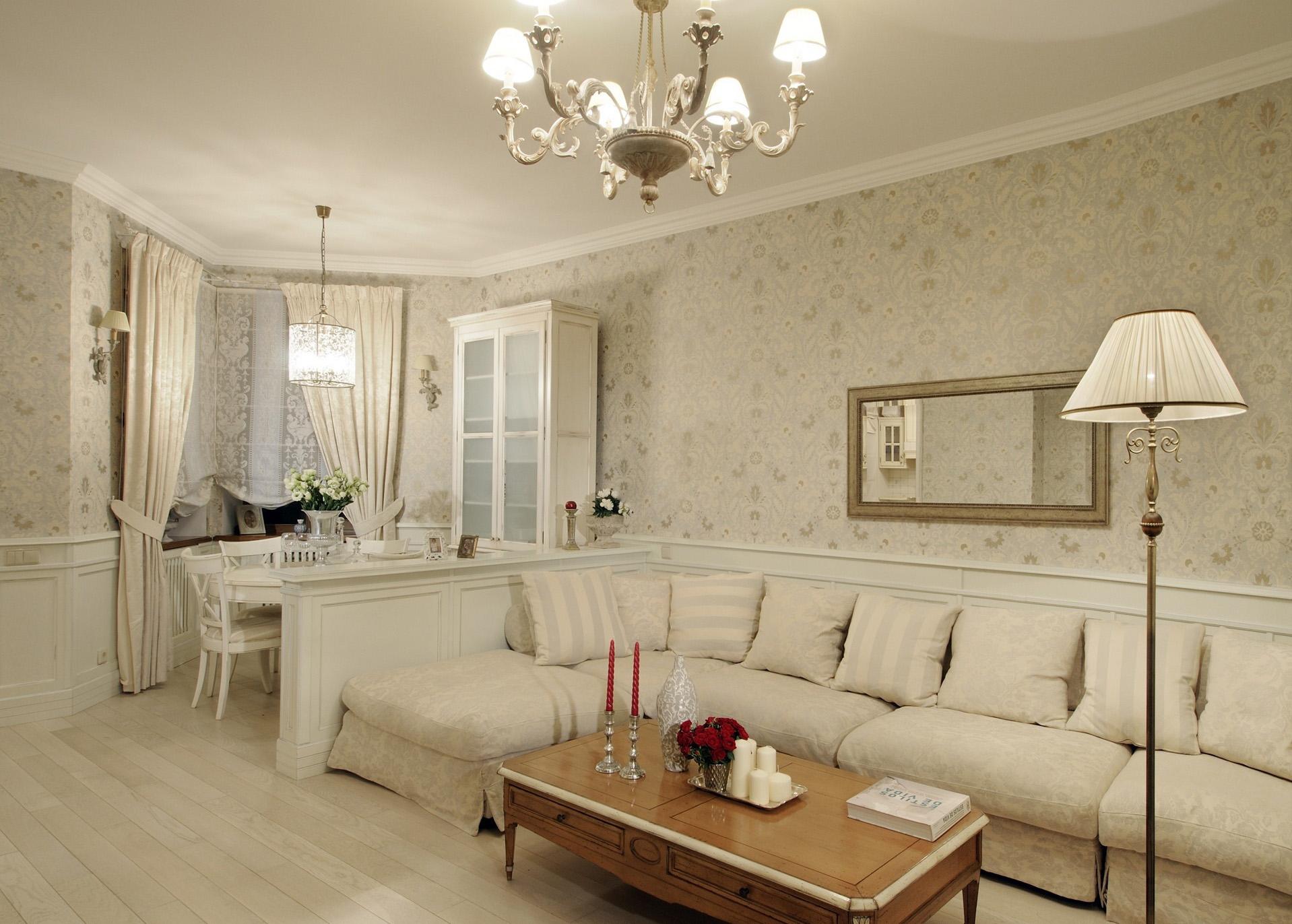 В комнате могут органично сочетаться и старинные, и современные предметы мебели, позолоченные элементы декора, расшитый под старину текстиль и другие детали. Ниже представлены стильные обои для зала, фото