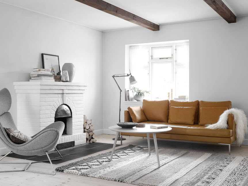 - Скандинавский стиль – это штукатурка или обои под белый кирпич, белая мебель, светлый диван, обтянутый экокожей.
