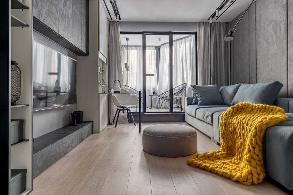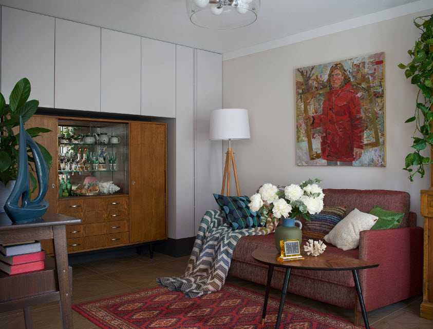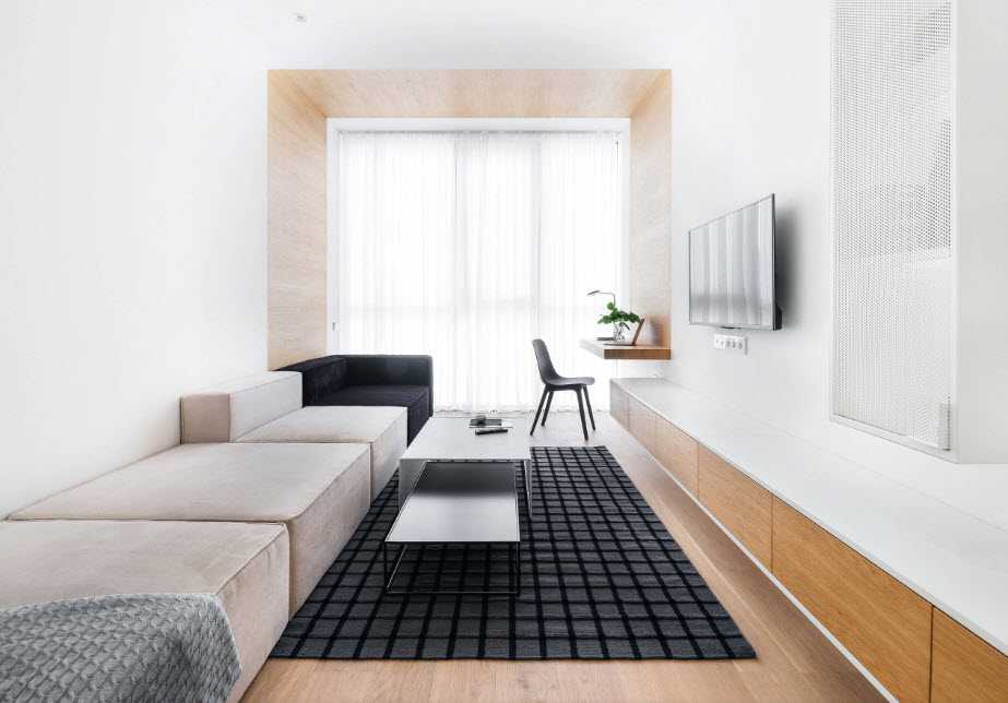 - минимальный комплект мебели: выбор либо дивана со стоящим рядом столиком, либо мягкого уголка, отказ от стенок, шкафов и стеллажей;