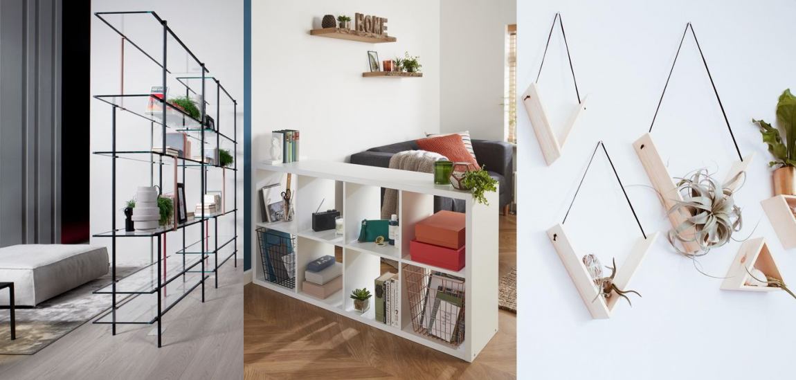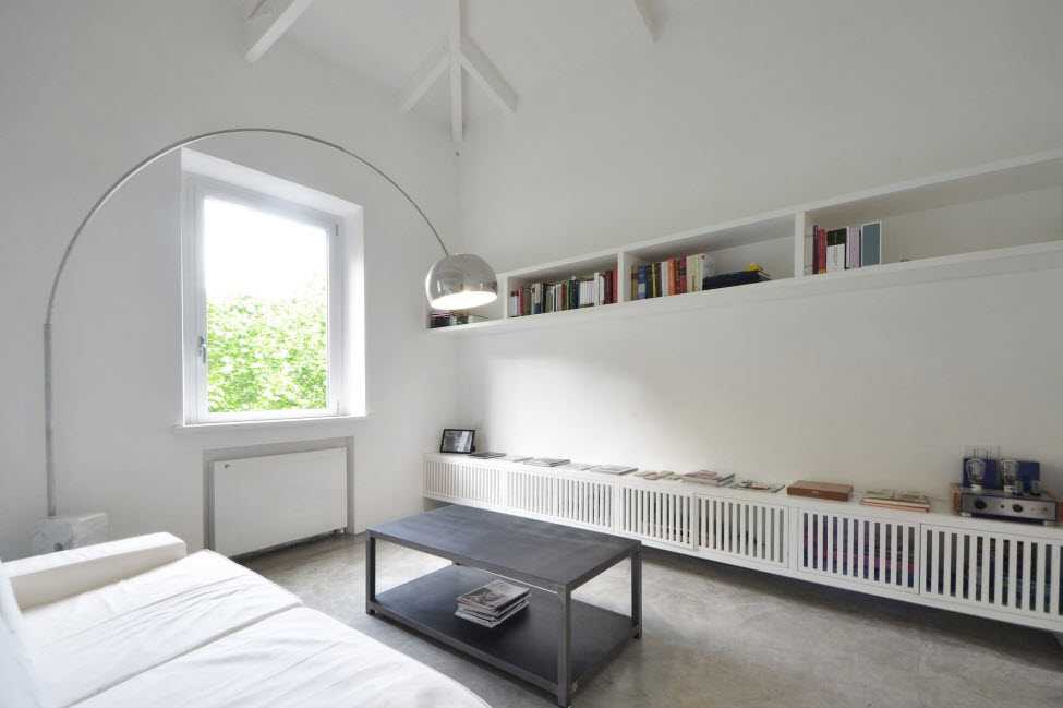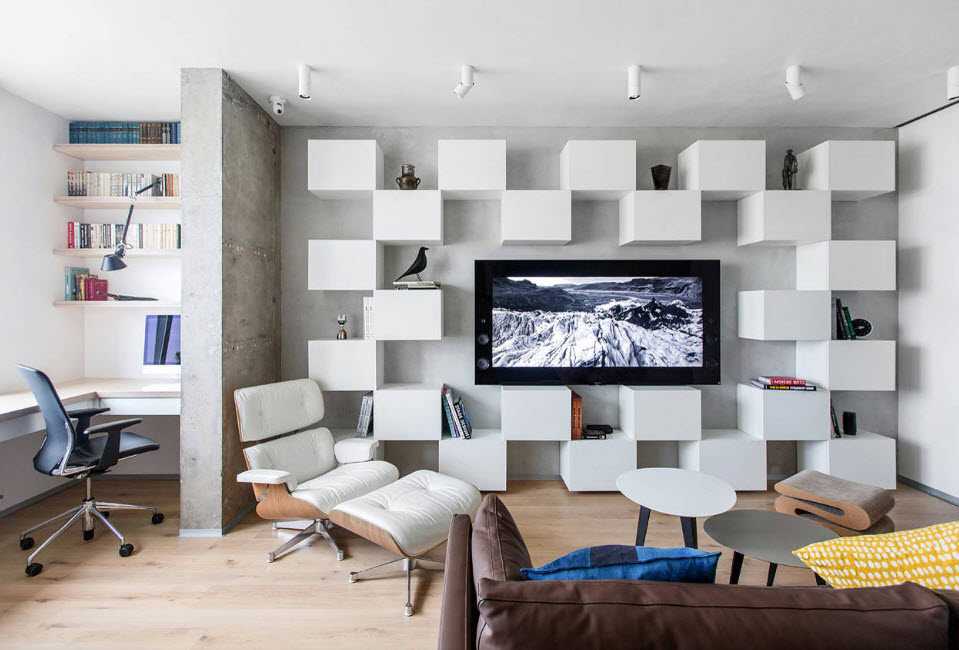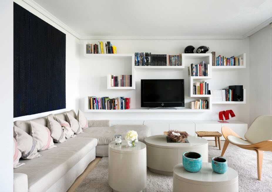 От громоздких систем хранения по возможности стоит отказаться, шкафам и буфетам предпочесть минималистичные открытые полки или «воздушные» стеллажи. Зрительно они не съедят столько место как массивная мебель. Стеллаж может использоваться как инструмент зонирования, если нужно разместить в гостиной рабочий кабинет или отделить её от кухонной зоны.