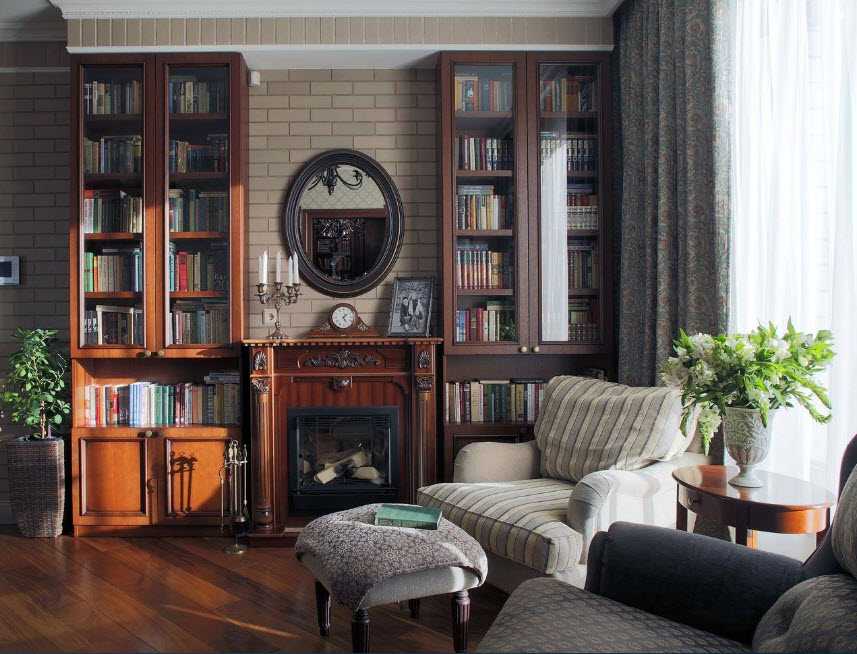 При классическом дизайне в условиях небольшой гостиной в малогабаритной квартире можно акцентировать внимание на камине, который, даже не выполняя своих основных функций, придаст комнате атмосферу уюта и комфорта.